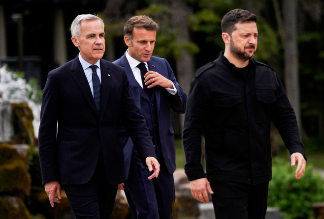 17일(현지시간) 캐나다 앨버타주 캐내내스키스에서 열린 주요 7개국(G7) 정상회의에서 마크 카니 캐나다 총리(왼쪽), 에마뉘엘 마크롱 프랑스 대통령(가운데), 볼로디미르 젤렌스키 우크라이나 대통령이 단체 사진 촬영을 위해 이동하고 있다./AP 연합뉴스 |
