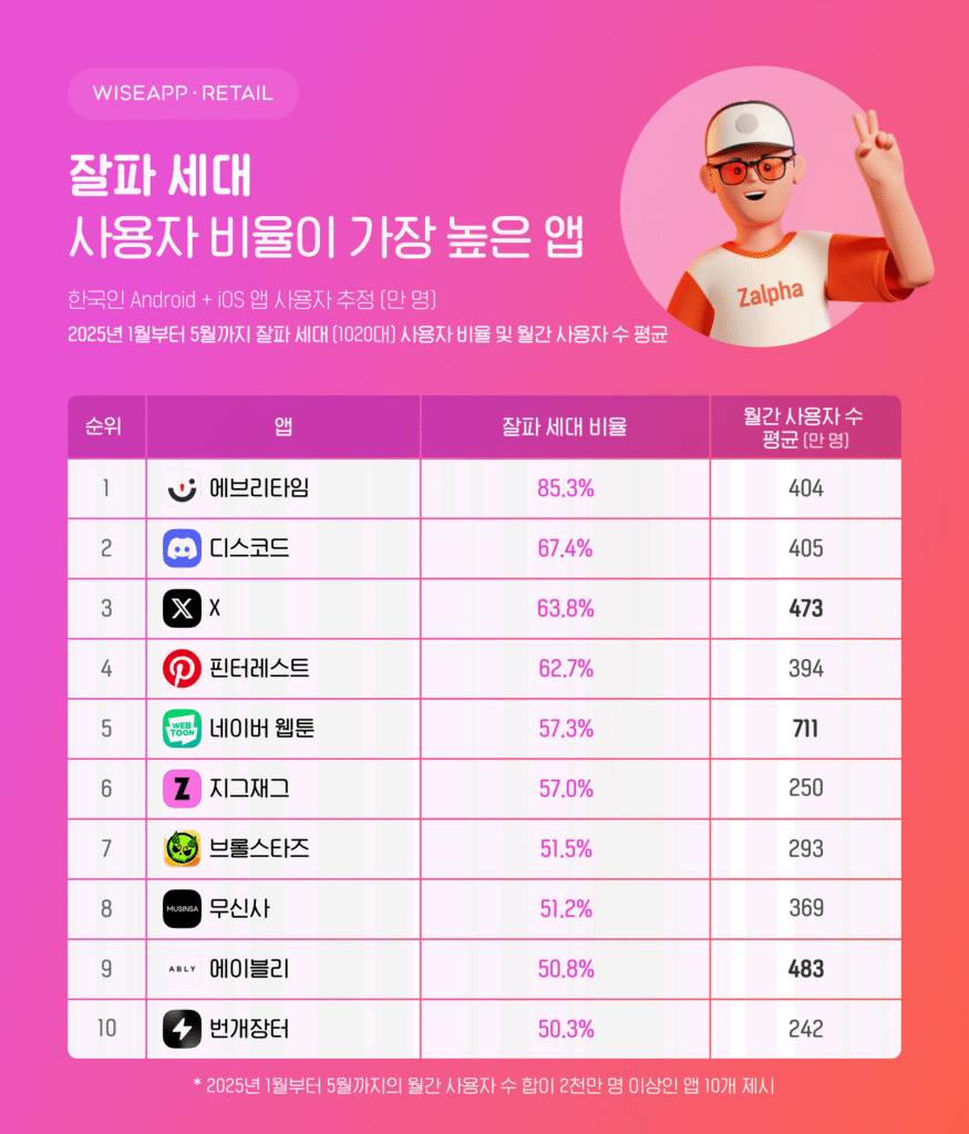 잘파세대 비율이 50% 이상인 앱 중에서 실제 월간 활성 사용자 수(MAU)가 가장 많은 앱은 네이버 웹툰으로 조사됐다. 네이버 웹툰은 711만 명의 월간 사용자를 기록하며 압도적 1위를 차지했다.이어 패션 쇼핑앱 에이블리가 483만 명으로 2위, X가 473만 명으로 3위를 기록했다. 디스코드 405만 명, 에브리타임 404만 명, 핀터레스트 394만 명, 무신사 369만 명, 브롤스타즈 293만 명, 지그재그 250만 명, 번개장터 242만 명이 뒤를 이었다.