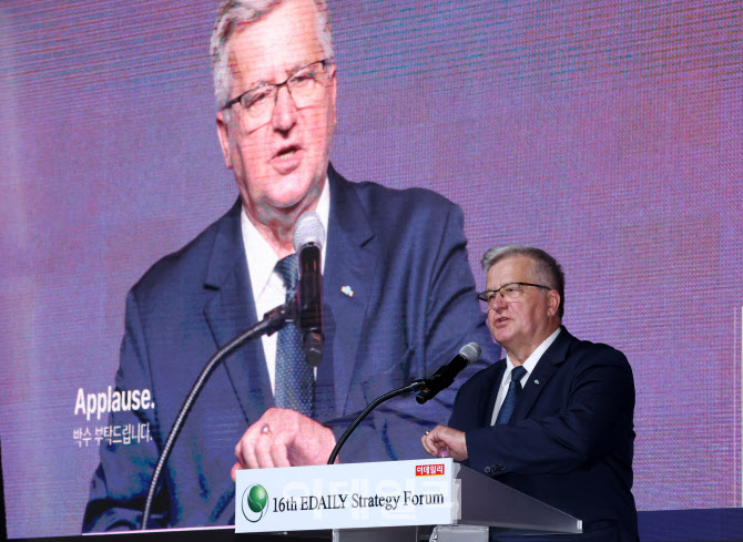 브로니스와프 코모로프스키 전 폴란드 대통령이 18일 서울 중구 장충동 서울신라호텔에서 열린 ‘제16회 이데일리 전략포럼’에서 ‘이미 현실이 된 미래···’인구 오너스‘ 시대의 리더십’이란 주제로 기조연설을 하고 있다.