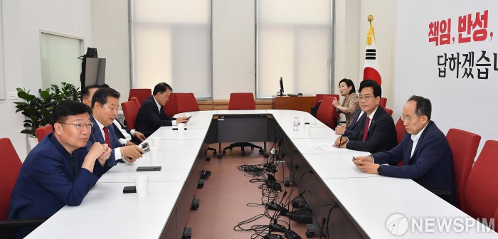 [서울=뉴스핌] 윤창빈 기자 = 국민의힘 송언석 원내대표와 3선 의원들이 18일 서울 여의도 국회에서 간담회를 하고 있다. 2025.06.18 pangbin@newspim.com