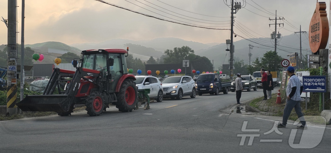 (용인=뉴스1) 김평석 기자 = 용인 원삼 반도체 주민생계조합과 용인반도체일반산업단지에 접한 9개 마을 주민들이 정당한 피해보상을 요구하며 18일 오전 6시부터 1시간 30분가량 산업단지 앞 도로에서 트랙터 시위를 벌였다. 시위로 시위 현장 주변 도로 1km 구간에서 극심한 정체현상이 빚어졌다. 2025.6.18/뉴스1