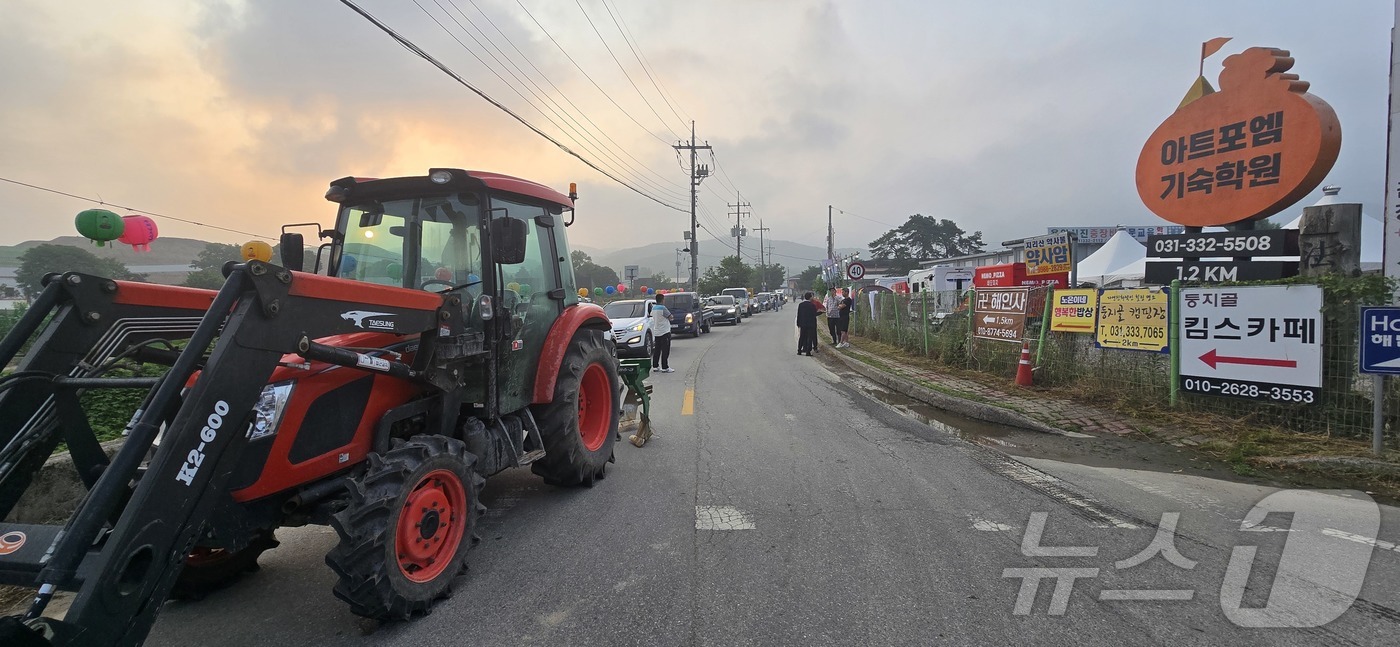 (용인=뉴스1) 김평석 기자 = 용인 원삼 반도체 주민생계조합과 용인반도체일반산업단지에 접한 9개 마을 주민들이 정당한 피해보상을 요구하며 18일 오전 6시부터 1시간 30분가량 산업단지 앞 도로에서 트랙터 시위를 벌였다. 시위로 시위 현장 주변 도로 1km 구간에서 극심한 정체현상이 빚어졌다. 2025.6.18/뉴스1
