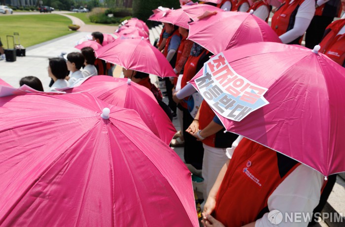 [서울=뉴스핌] 윤창빈 기자 = 서비스연맹 전국돌봄서비스노동조합이 18일 오후 서울 여의도 국회 본청 앞 계단에서 6.18 돌봄노동자 하루멈춤의 날 최저임금 대폭 인상 촉구, 돌봄노동자 하루멈춤 투쟁 기자회견을 열 피켓을 양산에 붙이고 있다. 2025.06.18 pangbin@newspim.com
