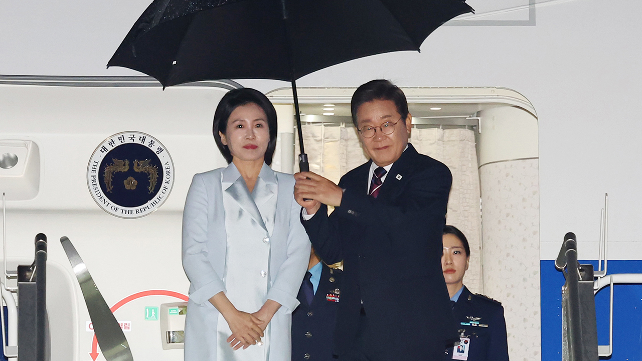 ▲ 이재명 대통령과 김혜경 여사가 17일(현지시간) 51차 주요 7개국(G7) 정상회의 일정을 마치고 캐나다 캘거리국제공항에서 귀국하며 공군 1호기에 오르고 있다.