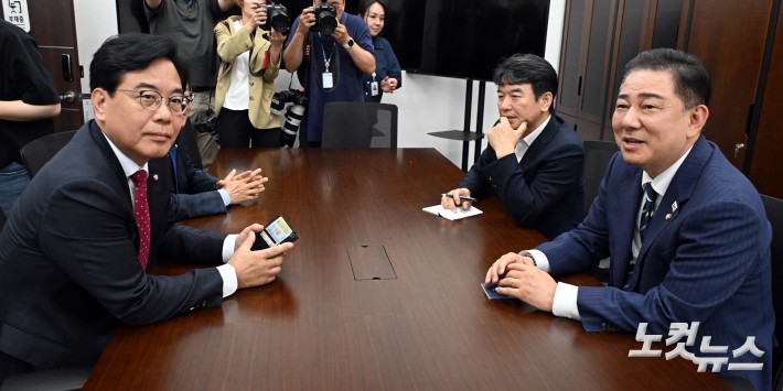더불어민주당 김병기 당대표 직무대행 겸 원내대표와 국민의힘 송언석 원내대표가 18일 오후 서울 여의도 국회에서 회동을 하고 있다.