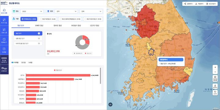 통계청이 18일부터 '청년통계지도'를 통계지리정보서비스(SGIS)를 통해 서비스한다고 밝혔다. 이는 청년층 인구, 주거형태, 취업 활동 등 사회·경제적 삶의 수준과 질의 변화를 시각화한 자료이다.