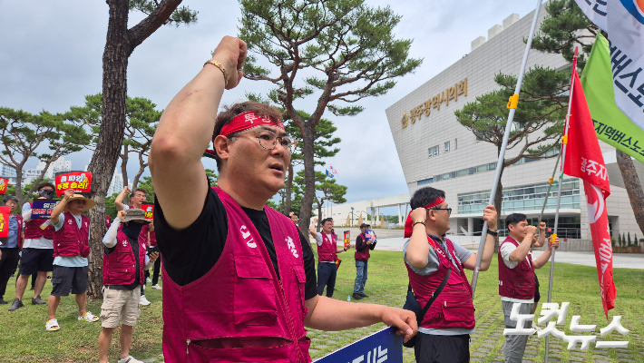 전국자동차노동조합연맹 광주지역버스노동조합이 지난 17일 광주 서구 광주시청 앞에서 궐기대회를 열고 광주시와 사용자 측의 성실한 교섭을 촉구하고 있다. 한아름 기자 |