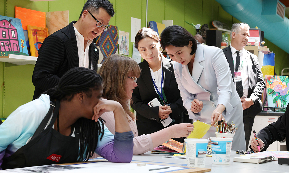 이재명 대통령의 부인 김혜경 여사가 17일(현지시간) 주요 7개국(G7) 정상회의 참석차 캐나다를 방문해 현지 국립장애인예술센터를 찾아 활동가들로부터 작품 설명을 듣고 있다. 캘거리=남정탁 기자 |
