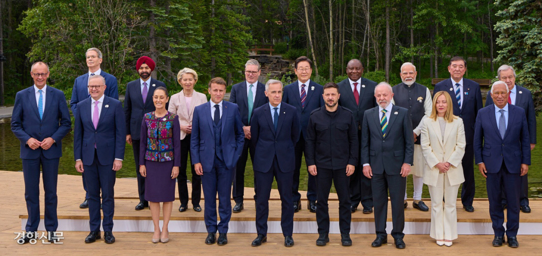 이 대통령, 세계의 정상들과 어깨 나란히 이재명 대통령이 17일(현지시간) 캐나다 앨버타주 캐내내스키스 주요 7개국(G7) 정상회의장에서 G7 및 초청국 정상들과 기념촬영을 하고 있다. 뒷줄 왼쪽부터 시계방향으로 스콧 베선트 미국 재무장관, 아제이 방가 세계은행 총재, 우르줄라 폰데어라이엔 유럽연합(EU) 집행위원장, 키어 스타머 영국 총리, 이 대통령, 시릴 라마포사 남아프리카공화국 대통령, 나렌드라 모디 인도 총리, 이시바 시게루 일본 총리, 안토니우 구테흐스 유엔 사무총장, 안토니우 코스타 EU 정상회의 상임의장, 조르자 멜로니 이탈리아 총리, 루이스 이나시우 룰라 다시우바 브라질 대통령, 볼로디미르 젤렌스키 우크라이나 대통령, 마크 카니 캐나다 총리, 에마뉘엘 마크롱 프랑스 대통령, 클라우디아 셰인바움 멕시코 대통령, 앤서니 앨버니지 호주 총리, 프리드리히 메르츠 독일 총리. 캐내내스키스 | 김창길 기자 |