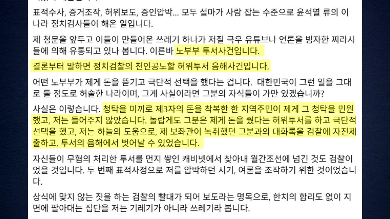 이어, 청탁을 미끼로 돈을 착복한 지역주민이 자신에게 민원을 했지만 들어주지 않았던 것이라며, 하늘의 도움으로 보좌관이 녹취했던 대화록을 검찰에 제출해 음해에서 벗어날 수 있었다고 설명했습니다.
