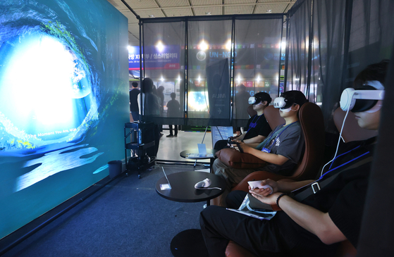 18일 서울 강남구 코엑스에서 ‘2025 메타버스 엑스포’가 열렸다. 위쪽부터 순서대로 가상현실(VR) 명상 체험. 현대차그룹의 4족 보행 로봇 스팟. 아비만의 로봇 캡슐 뽑기 시연. [연합뉴스, 뉴스1]