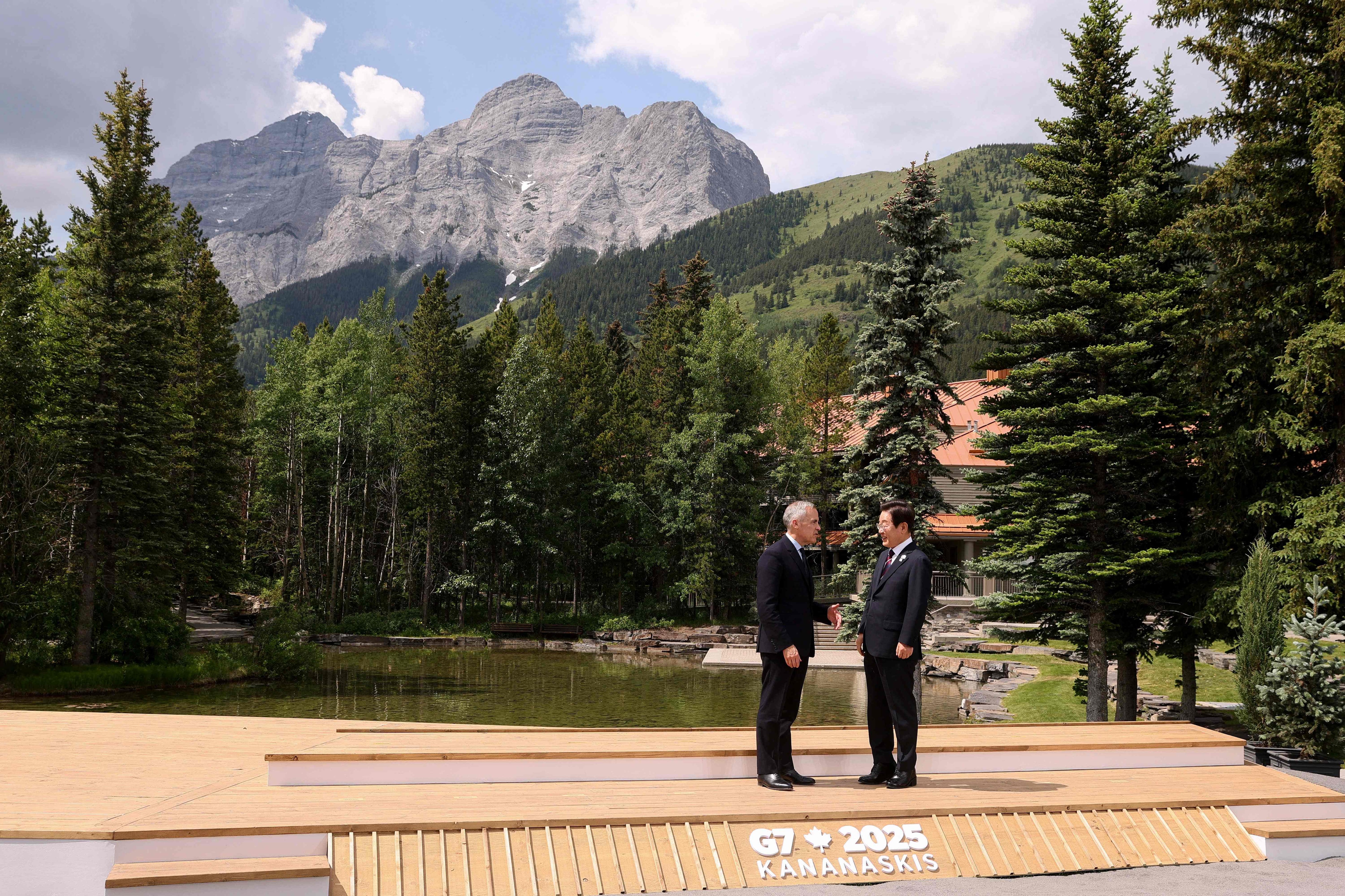 17일 G7 정상회담 이틀차, 캐나다 캐내내스키스에서 서로 인사를 주고 받는 마크 카니(왼쪽) 캐나다 총리와 이재명 대통령 뒤로 광활한 로키 산맥이 펼쳐져 있다. /AFP 연합뉴스 |