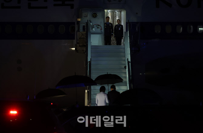 주요 7개국(G7) 정상회의 참석을 마친 이재명 대통령과 부인 김혜경 여사가 17일(현지 시간) 캐나다 앨버타주 캘거리국제공항에 도착해 공군 1호기에 탑승하고 있다.(사진=뉴시스) |