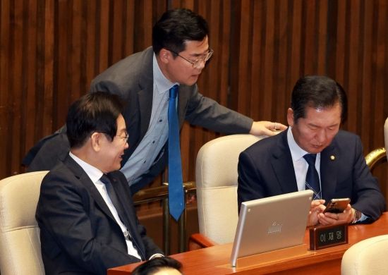 지난해 9월 이재명 당시 더불어민주당 대표와 박찬대 원내대표, 정청래 의원이 국회에서 열린 경제 분야 대정부 질문에서 대화하고 있다. 김현민 기자 |