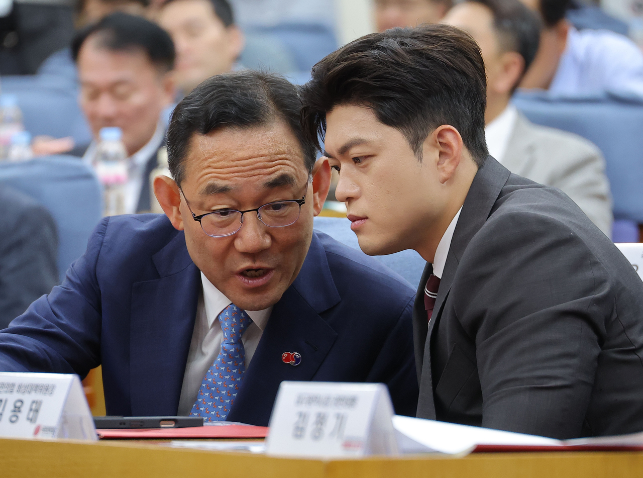김용태 국민의힘 비상대책위원장(오른쪽)과 주호영 국회부의장이 지난 18일 국회에서 열린 ‘군 공항 이전 사업’ 국정 과제 채택을 위한 국회 정책 세미나에 참석해 대화를 나누고 있다. [연합] |