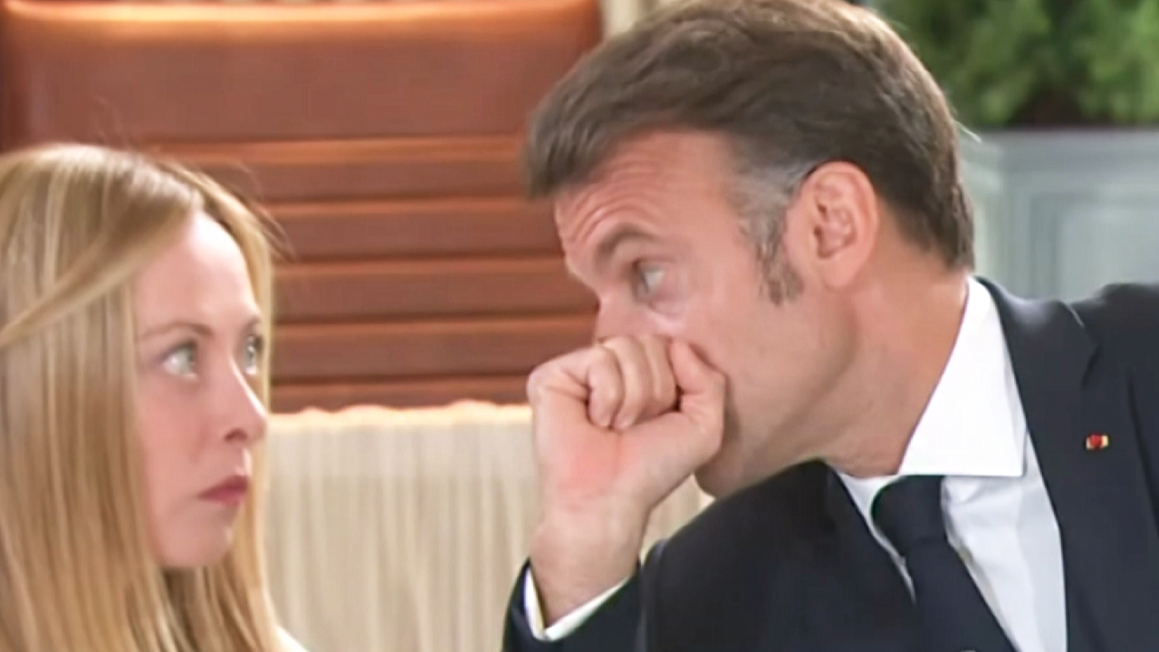 G7 주요 정상들이 모인 원탁에서 마크롱 프랑스 대통령과 멜로니 이탈리아 총리가 귓속말을 나누고 있습니다.