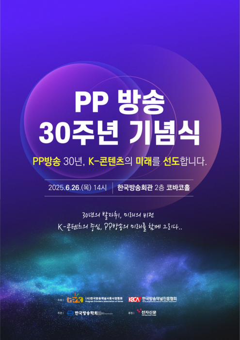 한국방송채널진흥협회, 한국방송채널사용사업자협회가 'PP 방송 30주년 기념식' 행사를 오는 6월 26일 오후 2시에 목동 방송회관 2층 코바코홀에서 개최한다고 19일 밝혔다.