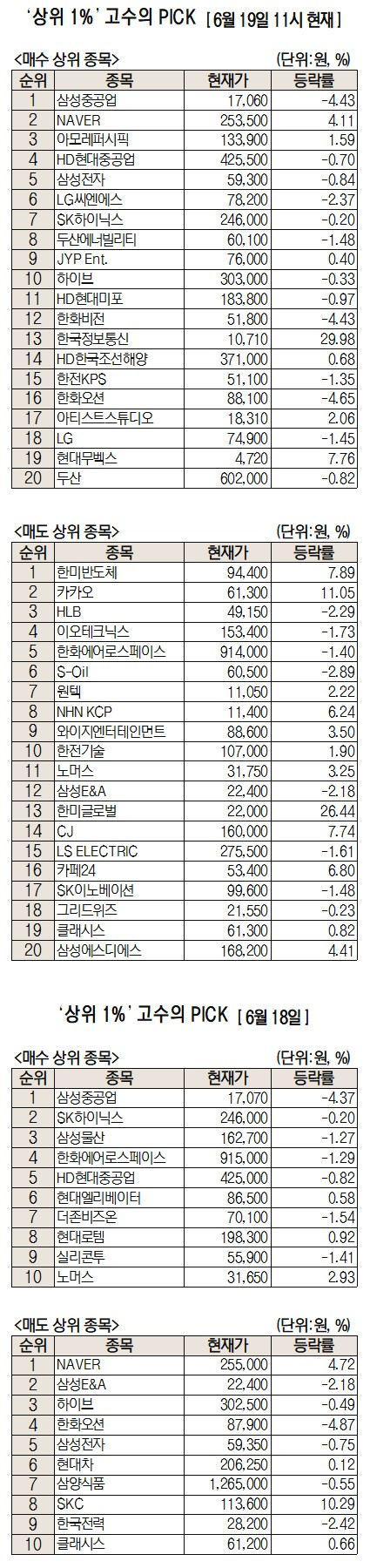 미래에셋증권에서 거래하는 고수익 투자자들이 19일 오전 가장 많이 순매수한 종목은 삼성중공업(010140), NAVER(035420), 아모레퍼시픽(090430) 등으로 집계됐다.