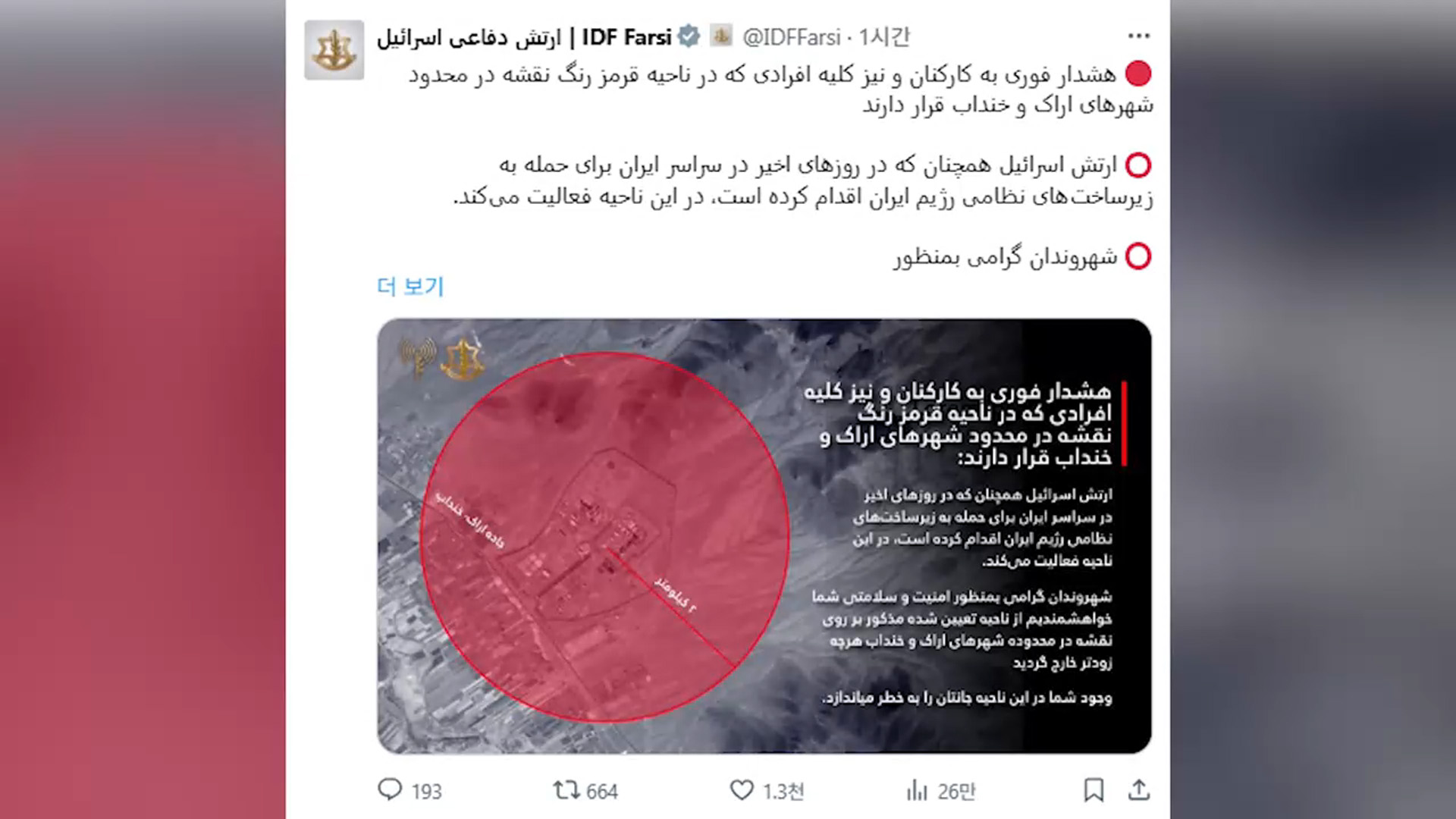 이스라엘군은 소셜미디어를 통해 "이란의 군사 시설물을 타격하기 전에 즉각 대피하라"고 경고하면서 중수로 시설 등 목표 지점을 빨간 원으로 표시한 위성 사진을 첨부했습니다.