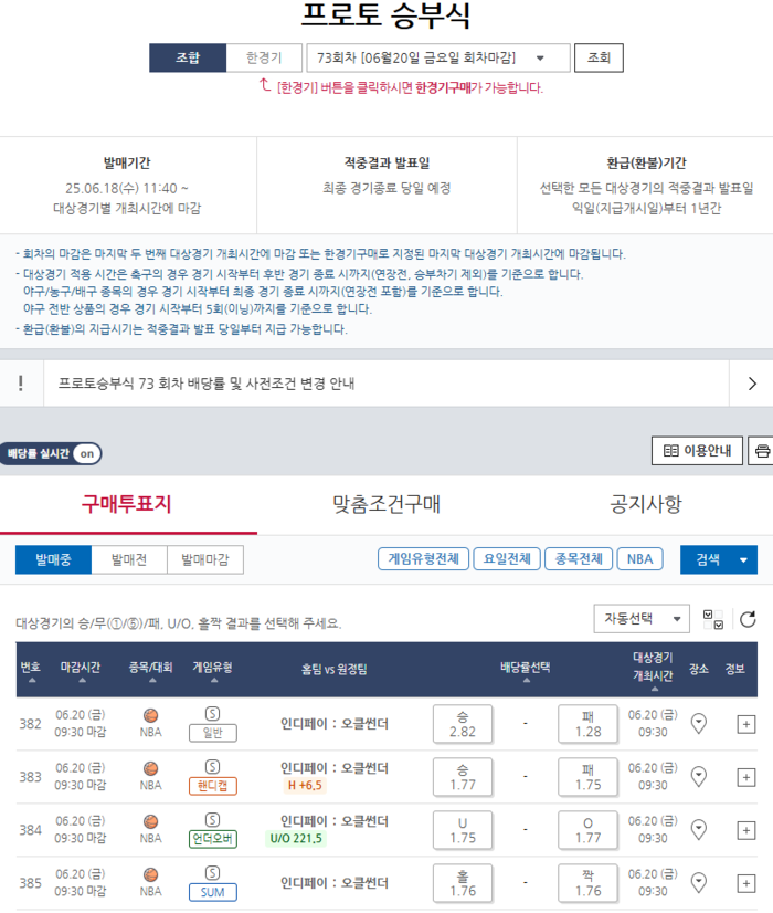 이번 인디애나(홈)-오클라호마(원정)전을 대상으로 하는 경기는 ▲382번(일반) ▲383번(핸디캡) ▲384번(언더오버) ▲385번(SUM) 등 총 4개 유형으로 참여할 수 있으며, 해당 게임들은 20일(금) 오전 9시 30분까지 전국 스포츠토토 판매점 및 공식 인터넷 발매사이트인 베트맨을 통해 구매가 가능하다.