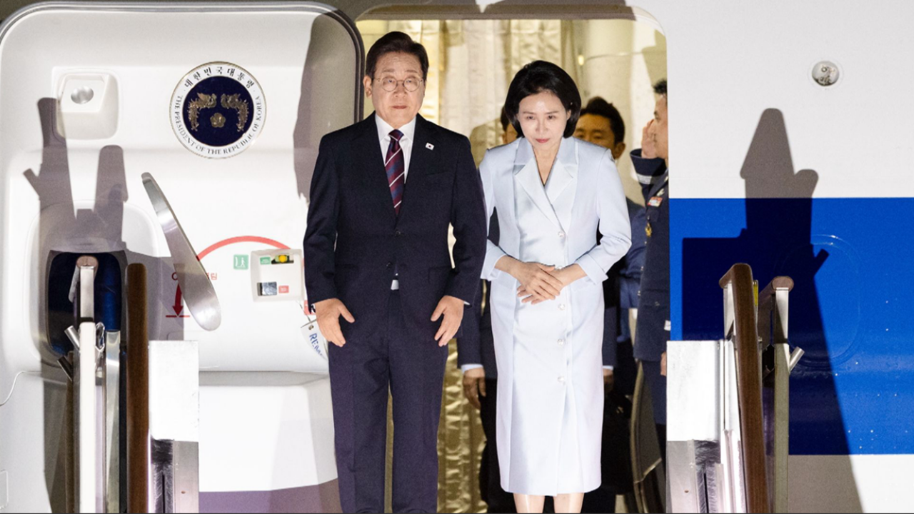 팔짱 낀 채 내리는 이재명 대통령과 김혜경 여사