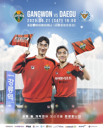 (서울=연합뉴스) 이영호 기자 = 프로축구 K리그1 강원FC가 오는 21일 오후 7시 강릉하이원아레나에서 열리는 대구FC와 하나은행 K리그1 2025 20라운드 홈 경기에 1만명 이상 관중이 들어오면 추첨을 통해 경차 '캐스퍼' 1대를 경품으로 준다고 19일 밝혔다.