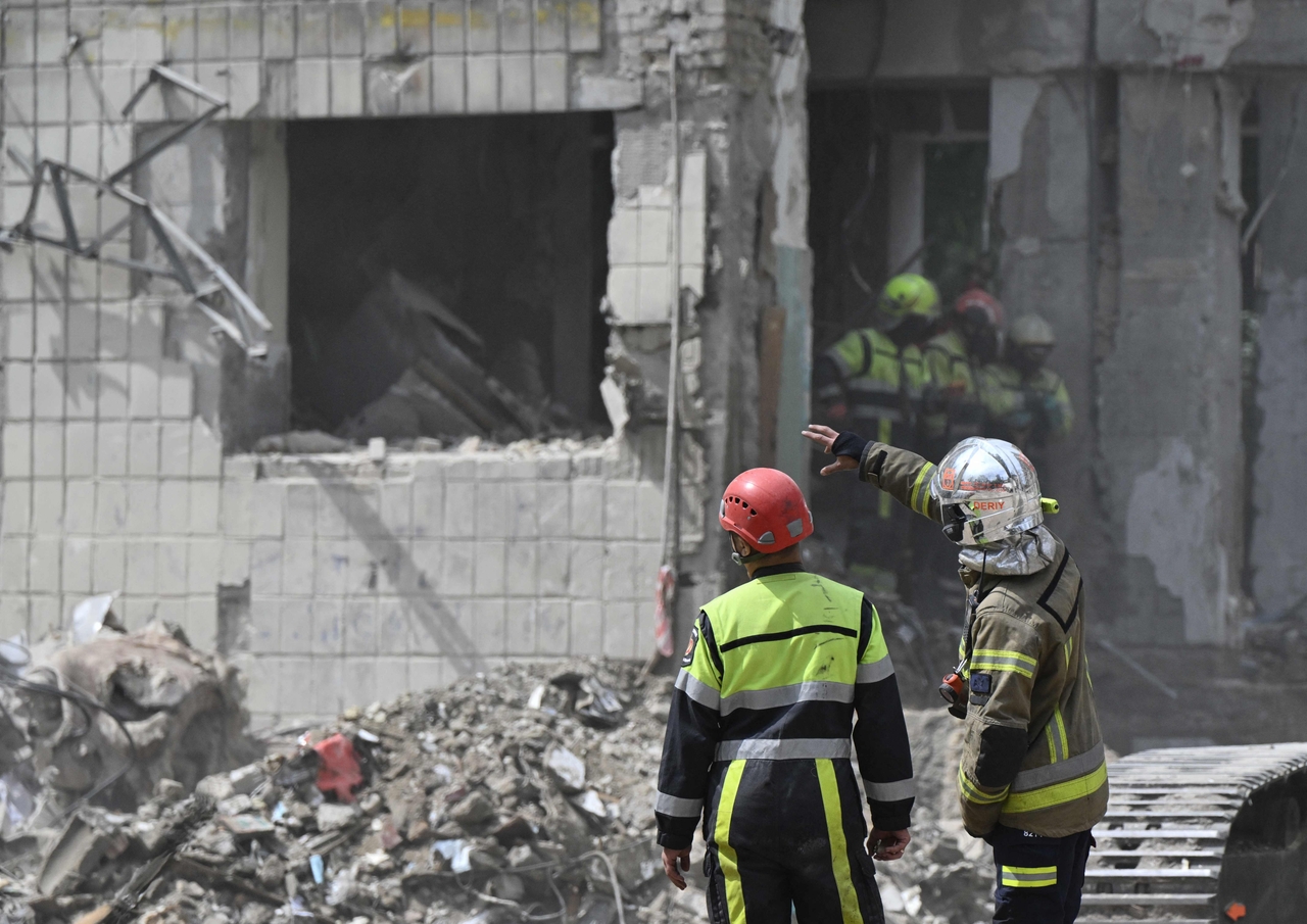우크라이나 구조대가 18일(현지시간) 수도 키이우에서 드론과 미사일 공습을 받은 건물 폐허를 수색하고 있다. [AFP] |