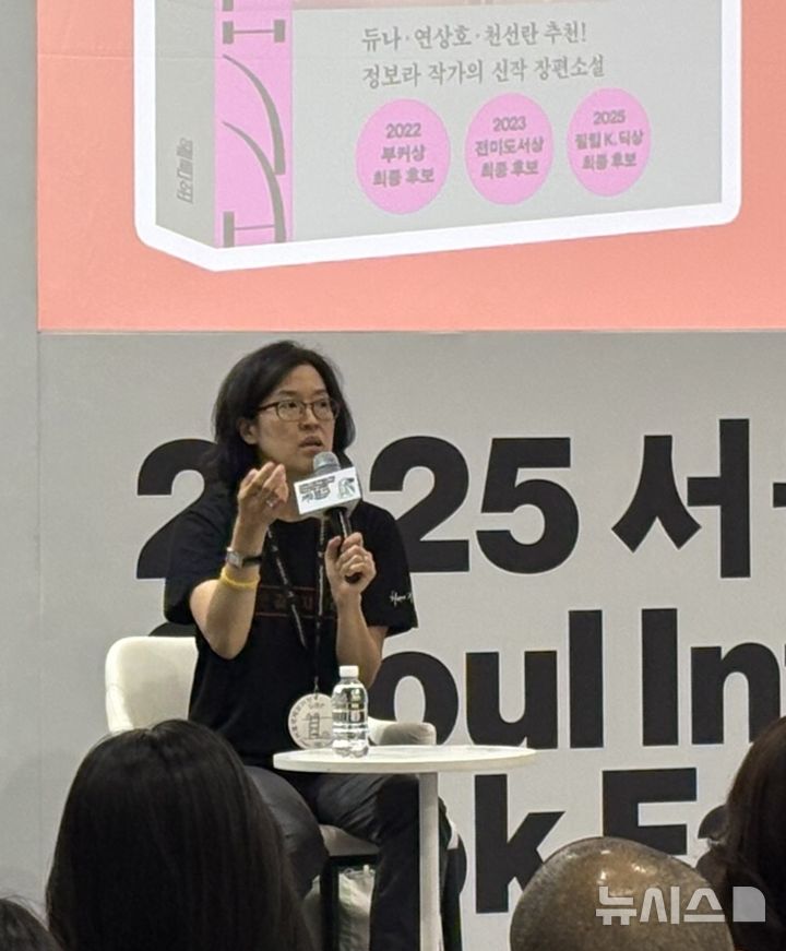 [서울=뉴시스]정보라 작가가 19일 서울 코엑스에서 열리고 있는 2025 서울국제도서전 북토크에서 신간 '아이들의 집'에 대해 이야기하고 있다. 조기용기자 |