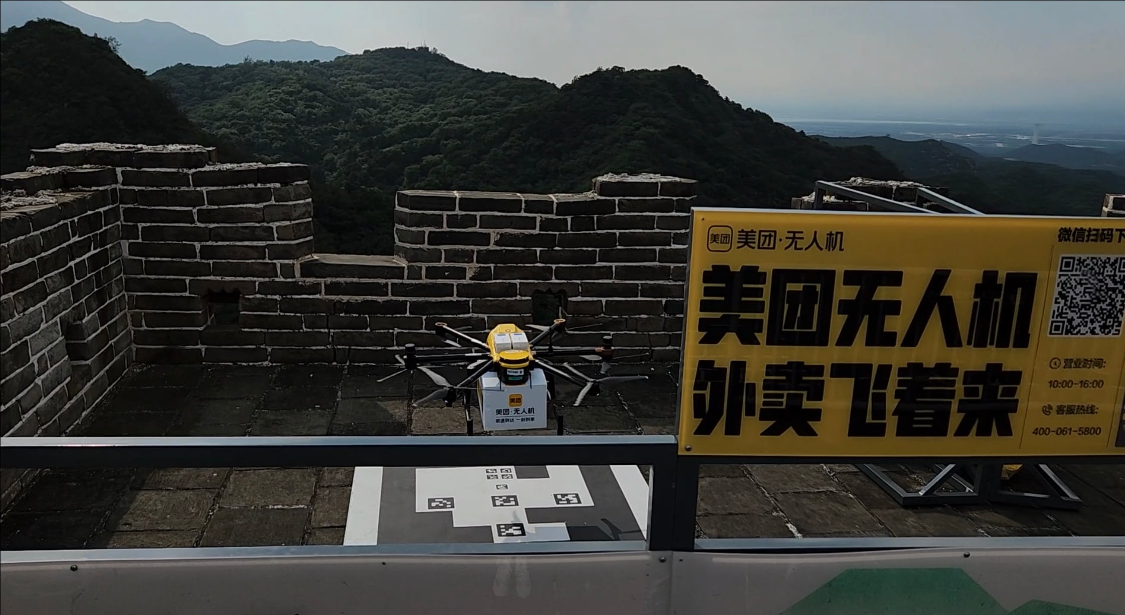 베이징 만리장성 바다링 구간에서 '중국판 배달의 민족'인 메이퇀이 드론 배달을 하는 모습. / 위챗 LDS |