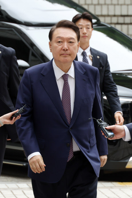 윤석열 전 대통령이 16일 서울 서초구 서울중앙지방법원에서 열린 내란 우두머리 혐의·직권남용 권리행사 방해 혐의 사건 7차 공판에 출석하고 있다. 윤 전 대통령의 법원 출석은 이재명 대통령의 ‘3대 특검’ 임명 후 처음이다. (사진=연합뉴스) |