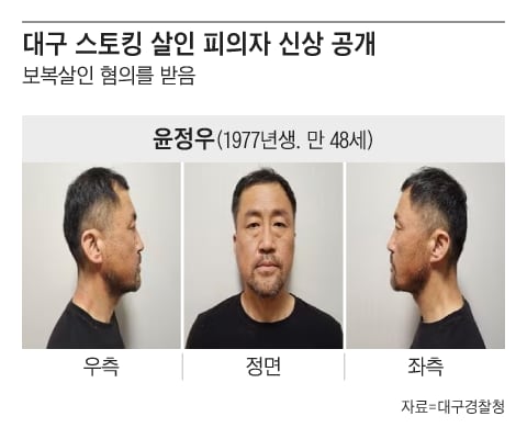 윤정우는 지난 10일 오전 3시 30분쯤 대구 달서구의 한 아파트에서 여성 B씨를 살해한(보복 살인) 혐의 등으로 구속된 상태다. 그는 범행 직후 부친의 묘소가 있는 세종시 부강면의 야산으로 도주했다가 범행 나흘 만인 지난 14일 오후 10시 45분쯤 세종시 조치원읍의 한 컨테이너 창고 앞에서 경찰에 체포됐다. 돈이 떨어진 윤정우가 지인에게 공중전화로 전화를 걸면서 덜미가 잡힌 것이다.