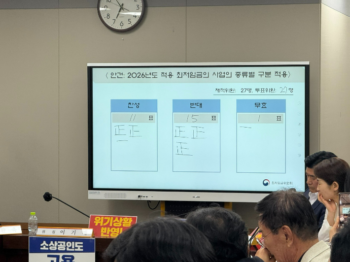 앞서 지난 5차 회의에도 관련 논의를 진행했지만, 이날 회의까지 입장차가 좁혀지지 않자 노-사-공익위원들은 표결 끝에 찬성 11표, 반대 15표, 무효 1표로 업종별 차등적용안이 부결됐다.
