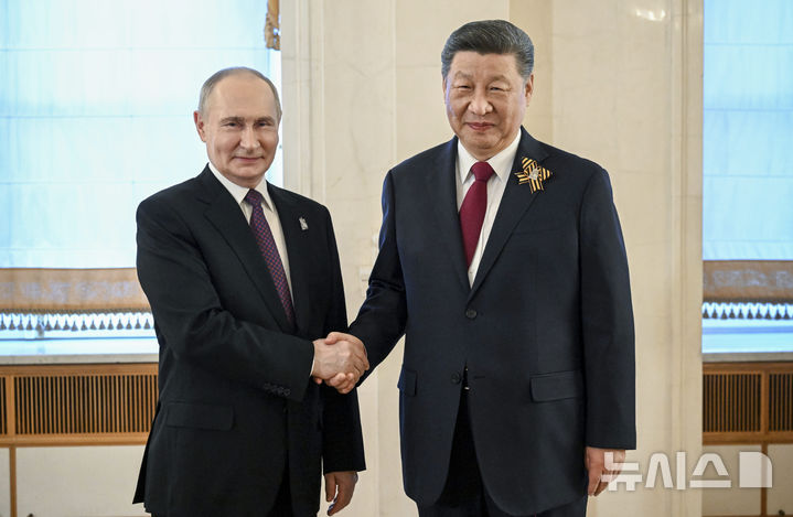 [모스크바=AP/뉴시스] 블라디미르 푸틴(왼쪽) 러시아 대통령이 8일(현지 시간) 러시아 모스크바 크렘린궁에서 열린 외국 대표단 환영 갈라 콘서트에 참석한 시진핑 중국 국가주석과 악수하고 있다. 2025.05.09. |