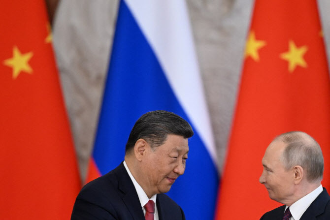 시진핑(왼쪽) 중국 국가주석과 블라디미르 푸틴 러시아 대통령이 지난 5월 8일 러시아 모스크바 크렘린궁에서 대화하고 있다. (사진=AFP) |