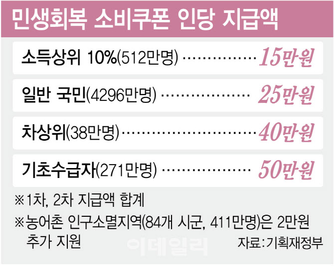 모든 국민은 두 차례에 걸쳐 15만~50만원의 지원금을 차등 지급받는다. 1차에는 차상위 계층(30만원)과 기초수급자(40만원)를 제외한 모든 국민이 15만원을 받는다. 인프라, 상권 등이 부족한 농어촌 인구소멸지역에 거주하는 이들에겐 2만원이 추가로 지급된다. 이후 2차로 건강보험료 등을 산정해 소득 상위 10%에겐 지급하지 않고 전 계층에게 10만원씩 지급한다. 전 국민의 90%에 해당하는 약 4296만명이 총 25만원 이상을 받게 되는 것이다.