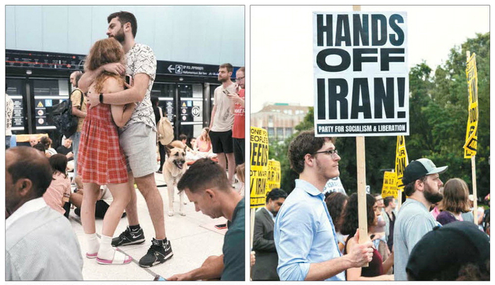 이스라엘 텔아비브 인근 라마트간에서 이란의 공습을 피해 지하철역으로 대피한 주민들이 공포를 이기기 위해 껴안고 있다(왼쪽 사진). 이날 미국 워싱턴DC 백악관 앞에서 친팔레스타인 시위대가 이스라엘의 대이란 공습에 미국의 참여를 검토하는 행정부에 항의하고 있다. [AP·AFP = 연합뉴스] |