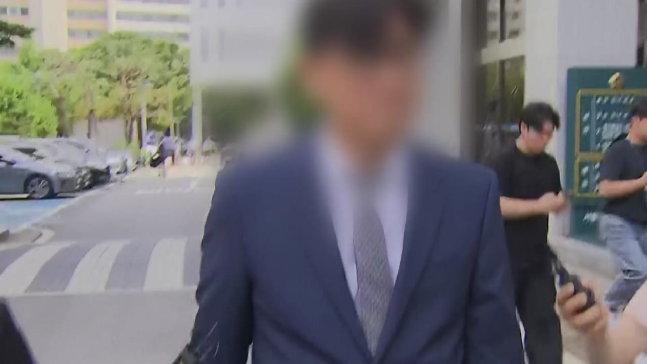 남색 양복을 입고 회색 넥타이를 한 남성이 법원을 빠져나옵니다.