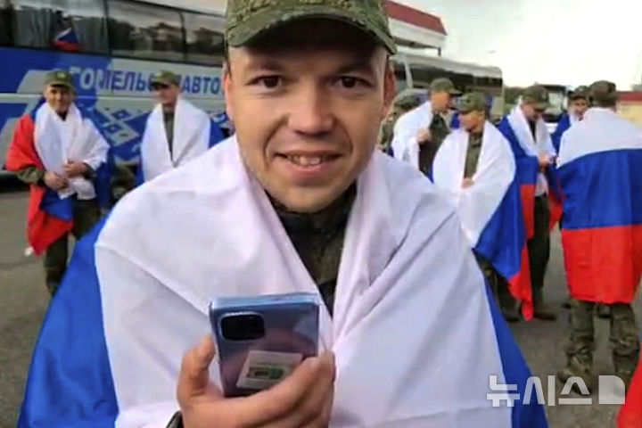 [벨라루스=AP/뉴시스] 19일(현지 시간) 러시아 국방부가 배포한 영상에서 포로 교환을 통해 귀환한 러시아군 병사가 벨라루스의 교환 지점에서 어머니와 통화하고 있다. 주변에는 러시아 국기를 든 병사들이 버스를 기다리고 있다. 2025.06.19. photo@newsis.com |