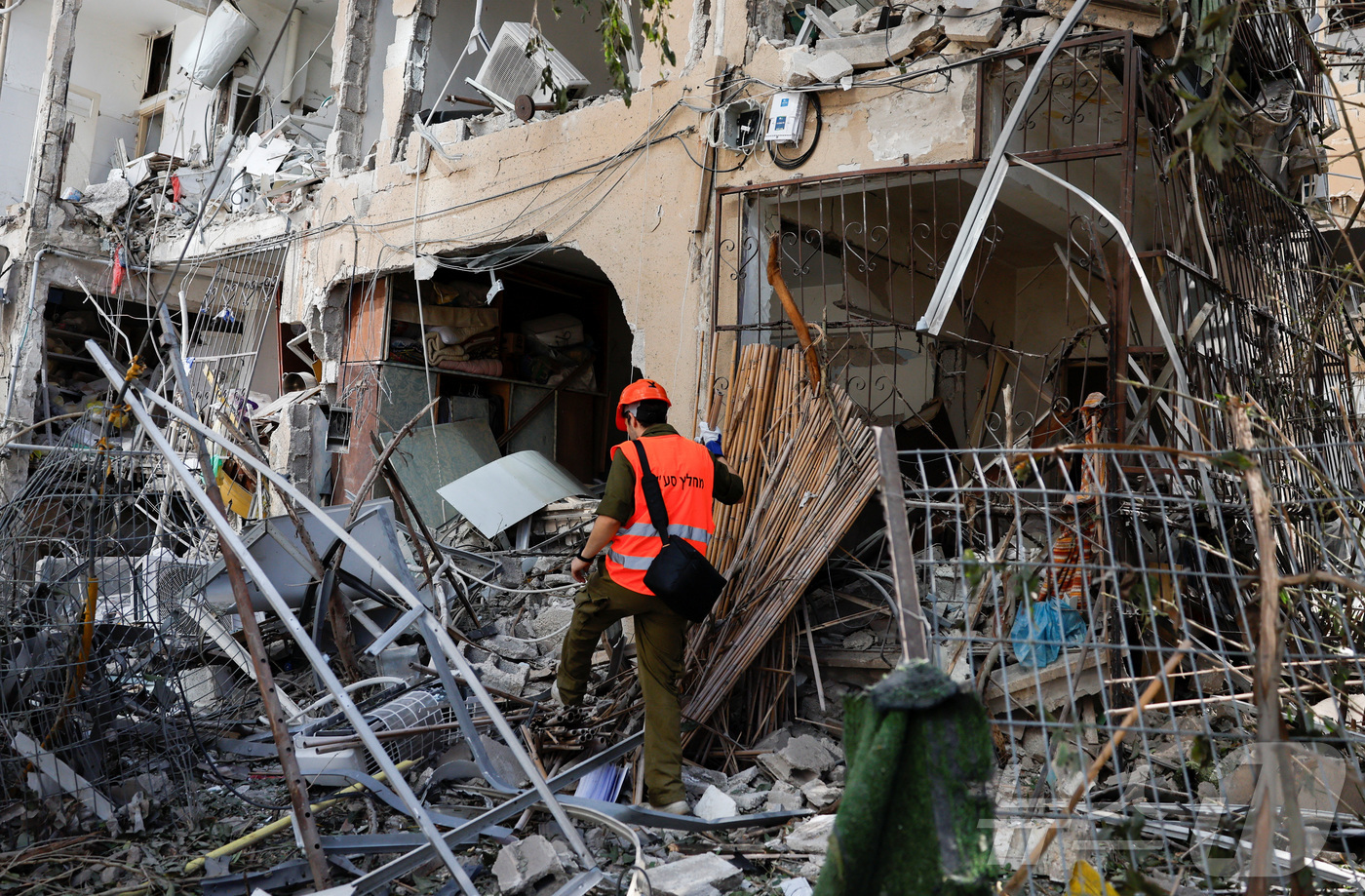 (라마트간 로이터=뉴스1) 강민경 기자 = 19일 이란의 미사일 공격을 받은 이스라엘 라마트 간의 한 건물에서 구조대원이 작업하고 있다. 2025.6.19 ⓒ 로이터=뉴스1
