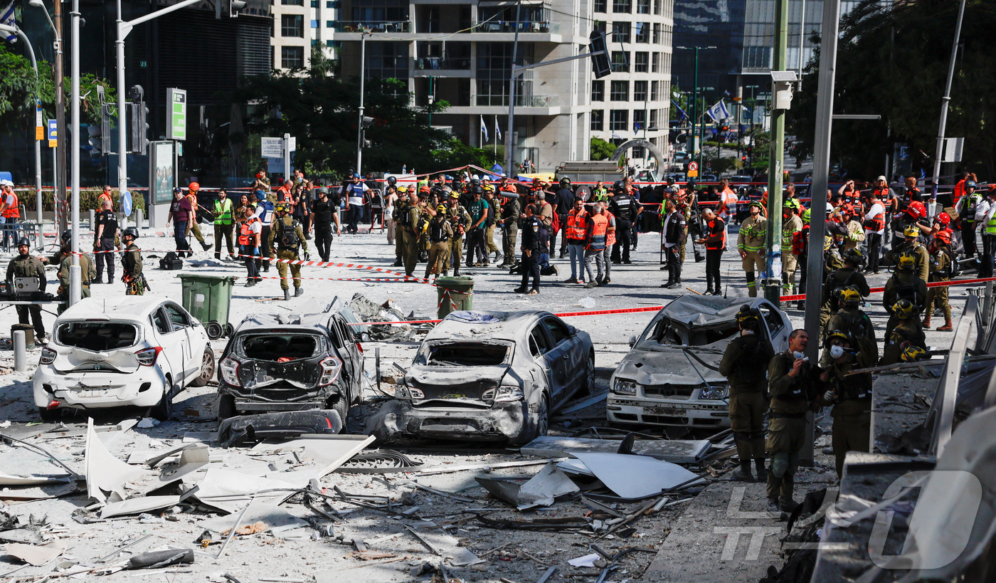 (라마트간 로이터=뉴스1) 강민경 기자 = 19일 이란의 미사일 공격을 받은 이스라엘 라마트 간에서 차량들이 종잇장처럼 구겨져 있다. 2025.6.19 ⓒ 로이터=뉴스1