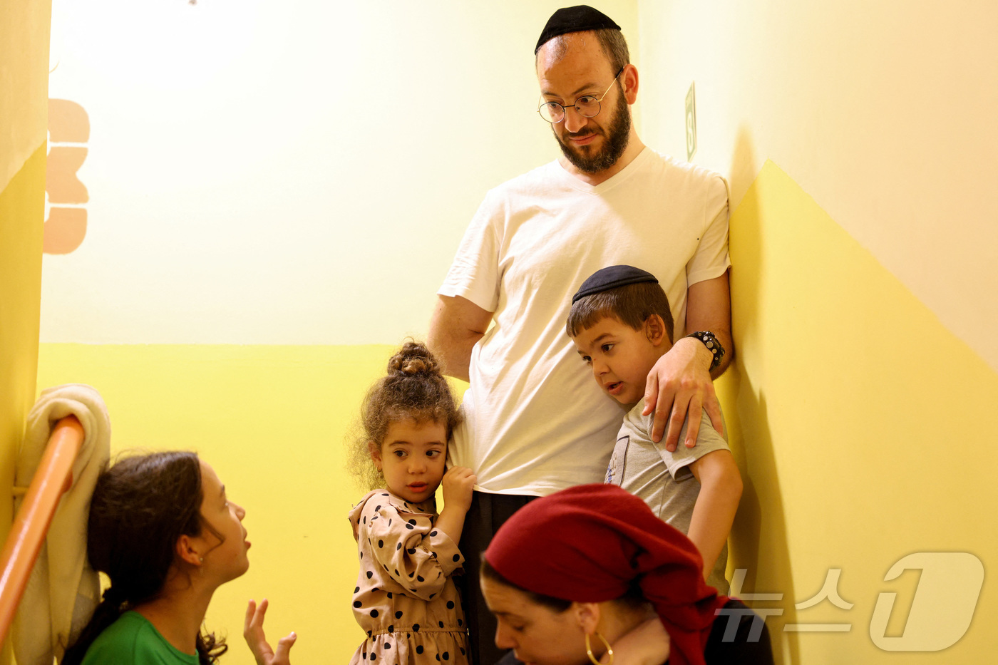 (하이파 로이터=뉴스1) 김예슬 기자 = 19일(현지시간) 이란 북부 도시 하이파에서 한 가족이 사이렌이 울리자 방공호로 대피했다. 25.06.19 ⓒ 로이터=뉴스1