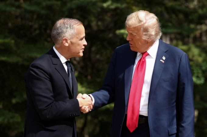 도널드 트럼프 미국 대통령과 마크 카니 캐나다 총리가 16일(현지시간) 캐나다 앨버타주 캐내내스키스에서 열린 주요 7개국(G7) 정상회의 공식 환영 행사에서 악수하고 있다. /로이터=뉴스1 |