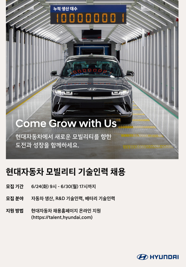 현대차는 전동화를 비롯한 미래 산업 트렌드에 적극적으로 대응하기 위해 다양한 역량과 전문성을 갖춘 모빌리티 기술인력을 선발할 계획이다. 서류 접수는 오는 24일부터 30일까지 총 7일간 진행된다.