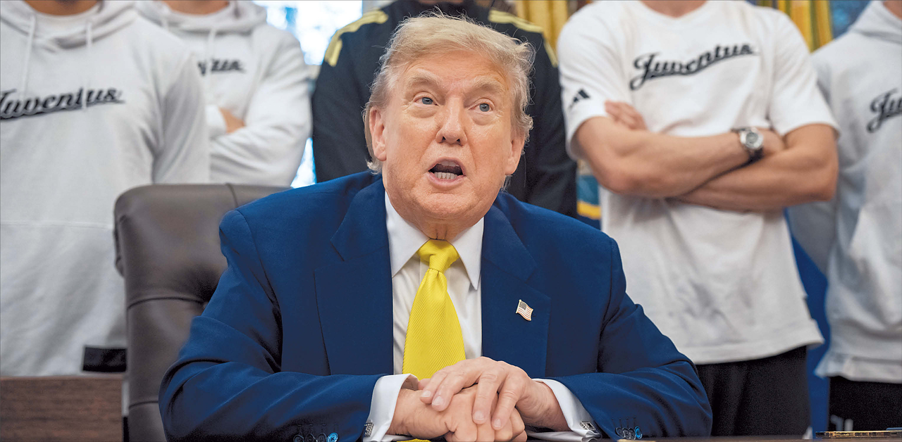 도널드 트럼프 미국 대통령이 이스라엘과 이란간 무역충돌에 대해서도 개입 여부를 ‘2주 안에’ 결정할 것이라고 밝힌 데 대해 다양한 반응이 나온다. 외신은 트럼프의 타임라인은 매번 ‘2주’라면서, 실제 기간이 지켜지는 데 대해선 회의적 견해를 내놓기도 했다. 사진은 노란색 넥타이를 멘 트럼프 대통령이 지난 18일(현지시간) 워싱턴 D.C. 백악관의 오벌 오피스에서 클럽월드컵 대회를 위해 방미한 이탈리아의 유벤투스 프로축구팀 선수들과 함께 언론과 이야기를 나누고 있는 모습 [로이터] |