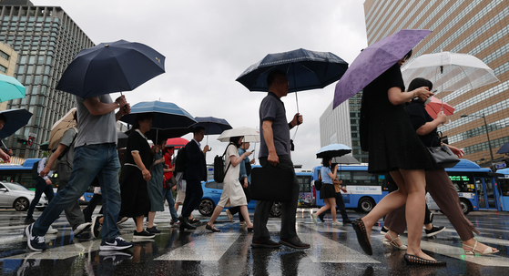 장마가 시작되며 서울 전역에 호우주의보가 내려진 20일 오전 서울 광화문네거리에서 우산을 쓴 시민들이 출근하고 있다. [뉴스1] |
