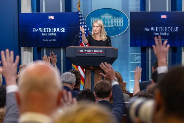 캐럴라인 레빗 백악관 대변인이 19일 미국 워싱턴 백악관 브리핑룸에서 도널드 트럼프 대통령의 성명을 대독하고 있다. 워싱턴=EPA 연합뉴스 |