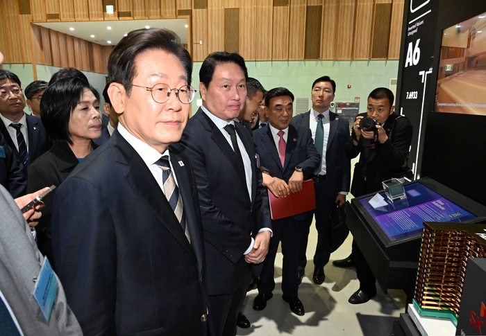 이재명 대통령이 20일 울산전시컨벤션센터에서 열린 인공지능(AI) 글로벌 협력 기업 간담회를 마친 뒤 AI 제품·서비스 시연을 참관하고 있다. 2025.6.20. 김호영기자