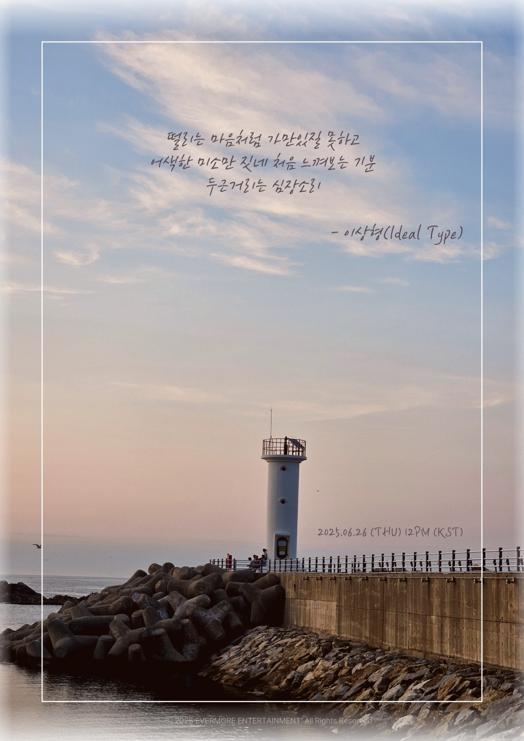 공개된 이미지엔 노을빛으로 물든 하늘과 잔잔한 바다, 홀로 선 하얀 등대가 시선을 끄는 풍경이 담겼다. 섬세한 구도가 만든 고요한 여운 속 "떨리는 마음처럼 가만있질 못하고 어색한 미소만 짓네 처음 느껴보는 기분, 두근거리는 심장소리"라는 시적인 문장이 더해져 한 편의 영화 같은 장면이 완성됐다.