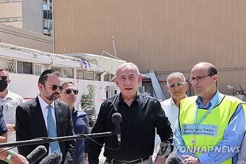 이스라엘 병원 앞에서 발언하고 있는 네타냐후 총리. [UPI=연합뉴스] |