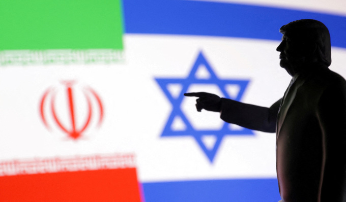 이란, 이스라엘 국기를 배경으로 서있는 도널드 트럼프 미국 대통령 모형 일러스트. [사진=로이터 뉴스핌] |